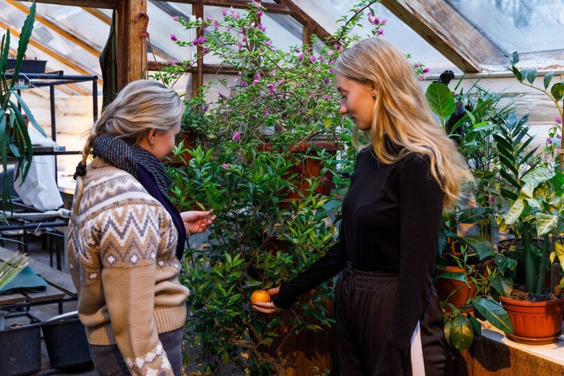 Созревший мандарин, который у многих вызывает новогодние ассоциации, доверили собрать самому молодому сотруднику теплицы Марии Гвоздевой. Заведующая теплицей Анна Кузнецова в это же время сняла лимон сорта «пандероза».