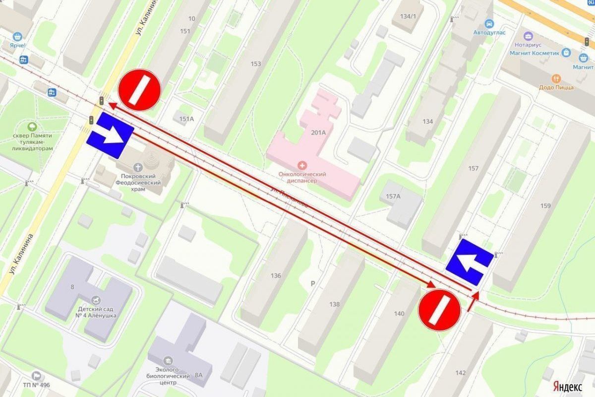 Новая схема движения затронут участок улицы Калинина по направлению к дому №142 по улице Плеханова. Аналогичная мера будет у дома №159А на улице Плеханова в сторону улицы Калинина.