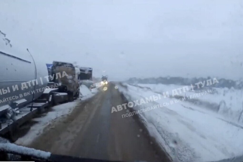 Видео с места опубликовано в Telegram-канале «Автохамы и ДТП | Тула». На кадрах видно два большегрузных автомобиля, которые столкнулись на заснеженной трассе. Точные причины аварии устанавливаются сотрудниками Госавтоинспекции.