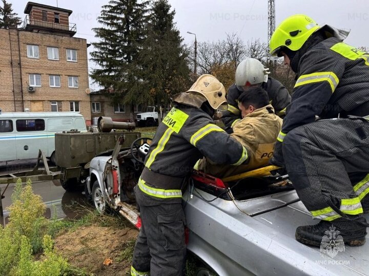 По условиям учебного сценария, водитель оказался заблокирован в поврежденном легковом автомобиле после столкновения.