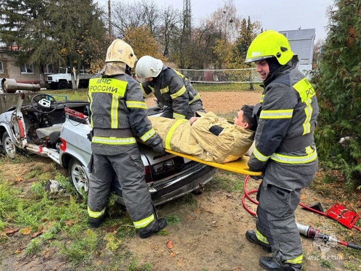 Сотрудники экстренных служб отрабатывали методы освобождения человека из транспортного средства и организацию первой помощи.