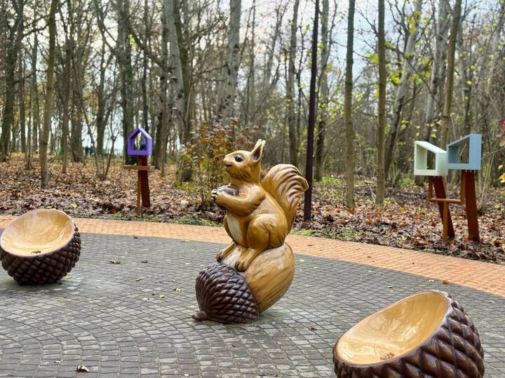 В парке появились две разновозрастные игровые площадки в стилистике осеннего и летнего леса, качели с музыкальным сопровождением из известных мультфильмов, спортивная зона с тренажерами, памп-трек, сцена, площадка для выгула собак и арт-объекты в лесной тематике. Также установлены образовательные стенды с информацией о растениях и обитателях леса, новые кормушки для белок и птиц, современное освещение и видеонаблюдение.