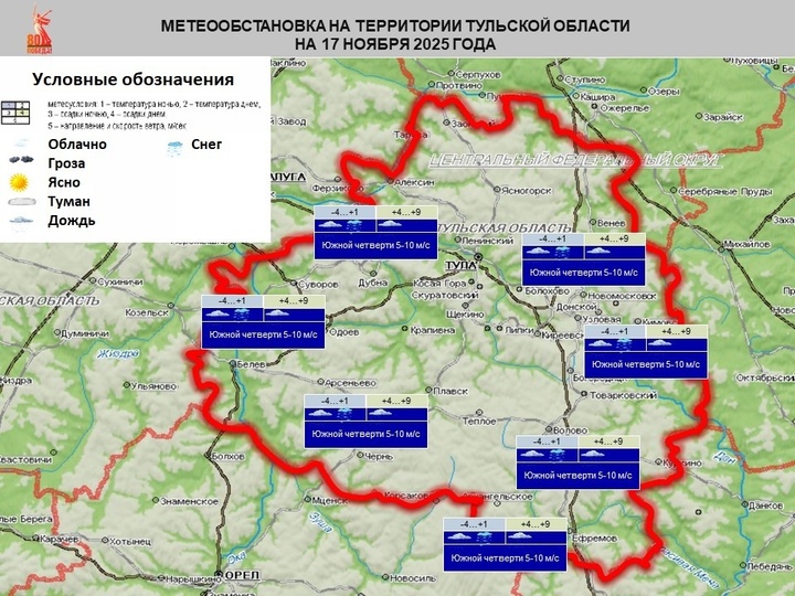 Об этом говорится в подготовленном тульскими спасателями оперативном ежедневном прогнозе ЧС на 17 ноября.