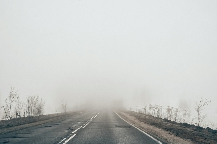 В условиях густого тумана самым разумным решением может стать прекращение движения и ожидание улучшения видимости.